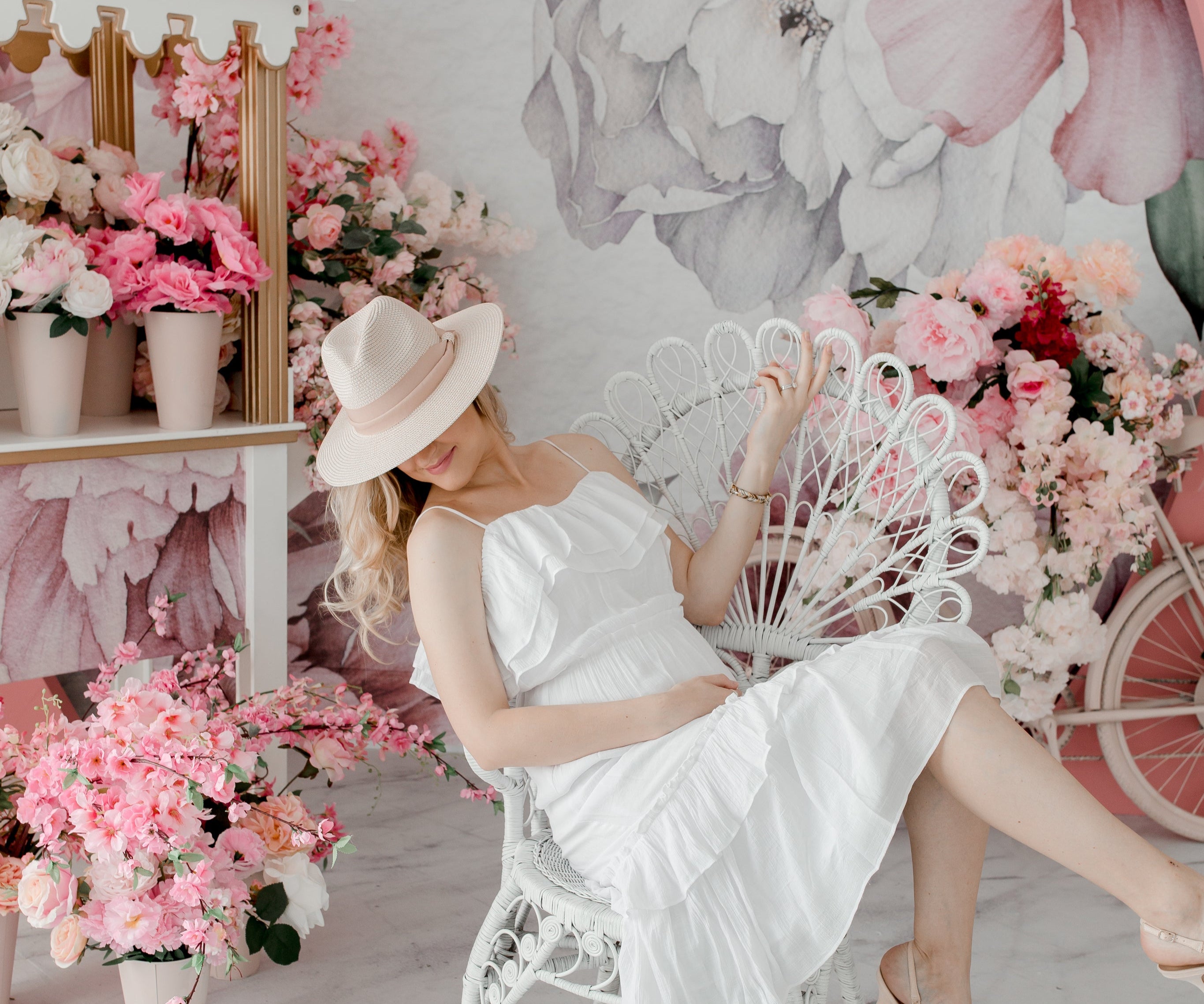 : Lace dress, pearl necklace, wide-brimmed Kentucky Derby hat in pastel